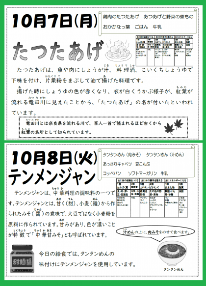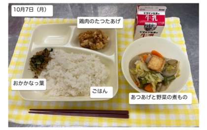 本日の給食は「鶏肉のたつたあげ・あつあげと野菜の煮もの・おかかなっ葉・ごはん・牛乳」が提供されます。しっかりかんでいただいて、残食ゼロをめざしましょう。