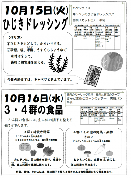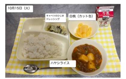 日の給食では「ハヤシライス・キャベツのひじきドレッシング・白桃(カット缶)・牛乳」が提供されます。しっかりいただいて、健康な身体の保持増進に努めましょう。