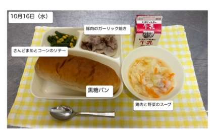本日の給食では「豚肉のガーリック焼き・鶏肉と野菜のスープ・さんまとまめとコーンのソテー・黒糖パン・牛乳」が提供されます。しっかりいただいて、健康な身体の保持増進に努めましょう。