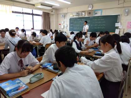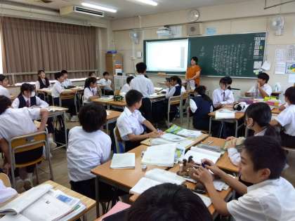 3年英語:関係代名詞を含む文の理解ができているかどうかをペアになって確認しました。一人が英文を読み、もう一人がその訳を答えました。