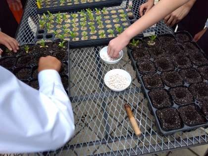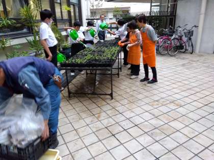 区役所の「種から育てる地域の花づくり事業」に参加し、ガーデニング部がパンジーとキンセンカを育てています。今日は区役所のボランティアの方と一緒に種から育てた苗の植え替えをしました。丁寧に水やりをしているので元気に育っています。