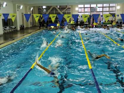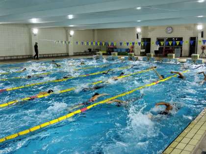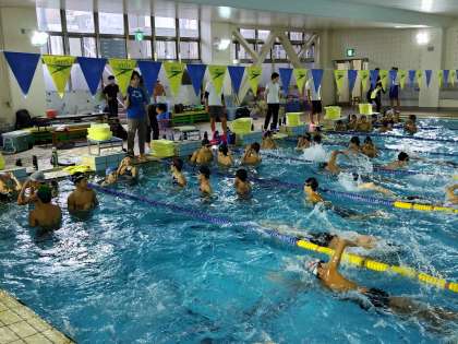 本日は上宮高校のプールをお借りして、合同練習を行っています。東、大淀、下福島、高倉、南の5校80人で練習しています。外は寒いですが、全員一生懸命泳いでいます。