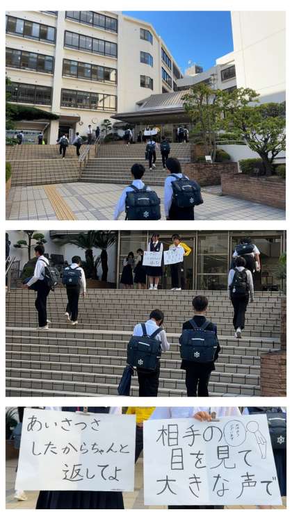 爽やかな秋晴れの朝を迎えました。新生徒会役員が、ポスターを手にして、挨拶活動です。