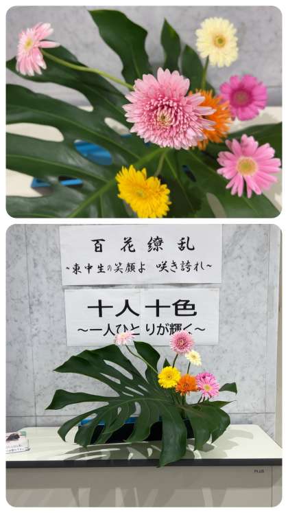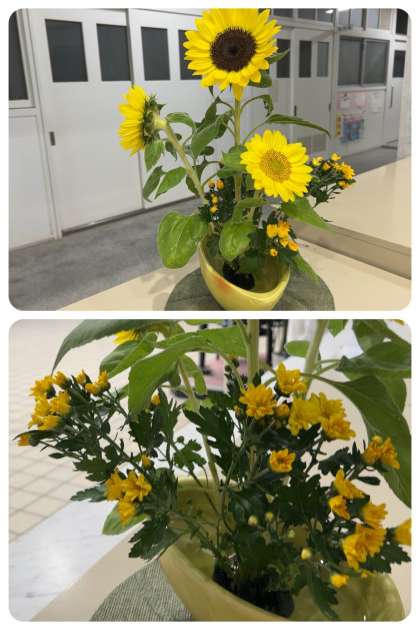 さて、玄関には『リズム』のお題で、新しく『モンステラとガーベラ』を、また、玄関ホールには『ひまわりと小菊』、職員室前には『コスモス』を活けていただきました。いつも東中学校のためにありがとうございます。