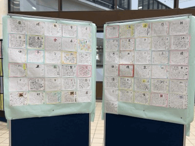 上のGIFファイルは、1階の多目的室に展示されている『技術と家庭』の作品です。2つ目GIFファイルは、玄関ホールに展示されている『国語』の作品です。ぜひゆっくりとご鑑賞ください。