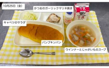 本日の給食では、「かつおのガーリックマリネ焼き・ウインナーとじゃがいものスープ・キャベツのサラダ・発酵乳・パンプキンパン・牛乳」が提供されます。しっかりいただいて、健康の保持増進に努めましょう。