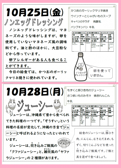 来週月曜日には、「もずくと豚ひき肉のジューシー・さつまいものみそ汁・焼きれんこん・牛乳」が提供されます。「ジューシー」は、沖縄県で昔から食べられてきた料理の一つです。お楽しみに。