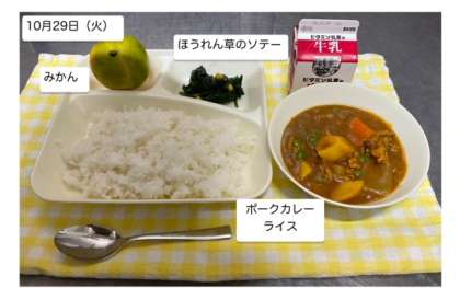 本日の給食では、「ポークカレーライス・ほうれんそうのソテー・みかん・牛乳」が提供されます。しっかりいただいて、午後の活動に備えましょう。