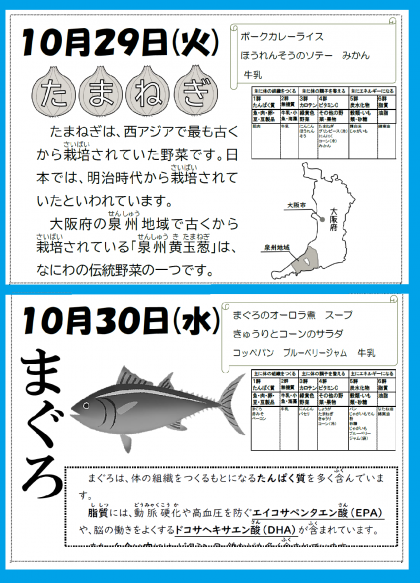 明日は、「まぐろのオーロラ煮・スープ・きゅうりとコーンのサラダ・コッペパン・ブルーベリージャム・牛乳」が提供されます。お楽しみに。