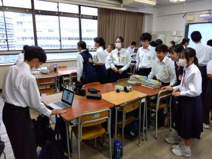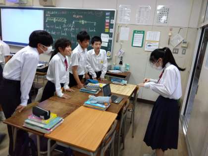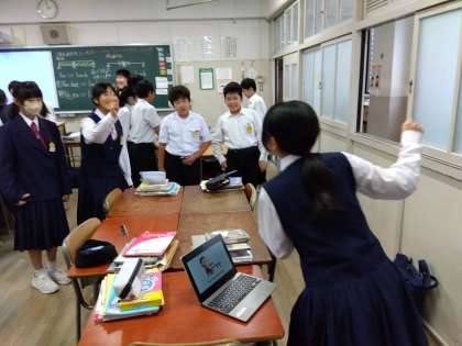 1年英語:現在進行形を使ったジェスチャーゲームをしました。班対抗で、1人がPCに出題された英文を見てジェスチャーをし、他のメンバーが"You are 〜ing."と答えます。楽しく英語を学ぶことができました。