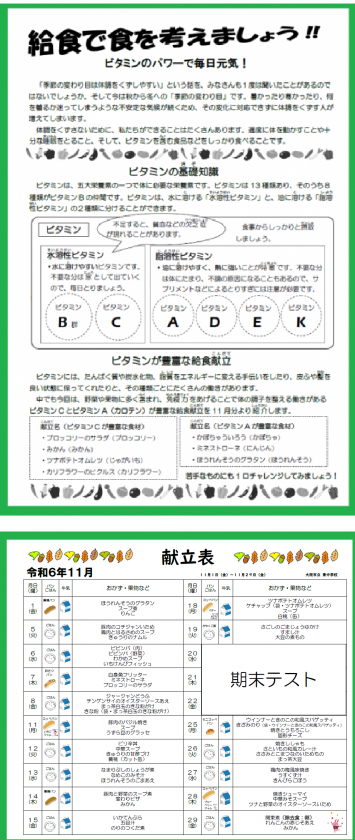 『給食で食を考えましょう!!』では、『ビタミンのパワーで毎日元気!』の見出しの記事があります。体調を維持するために、『適度な運動』と『十分な睡眠』、『ビタミンを含む食品などをしっかり食べること』を心がけましょう。