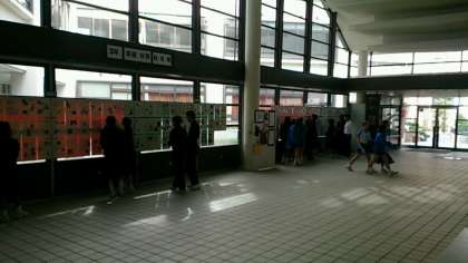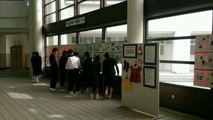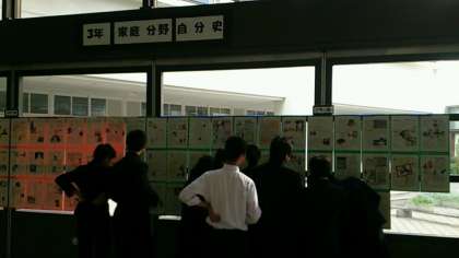 技術・家庭科の家庭科分野で3年生が作成した『自分史』が東中ホールに掲示しています。休み時間には、多くの東中生が見学にきています。