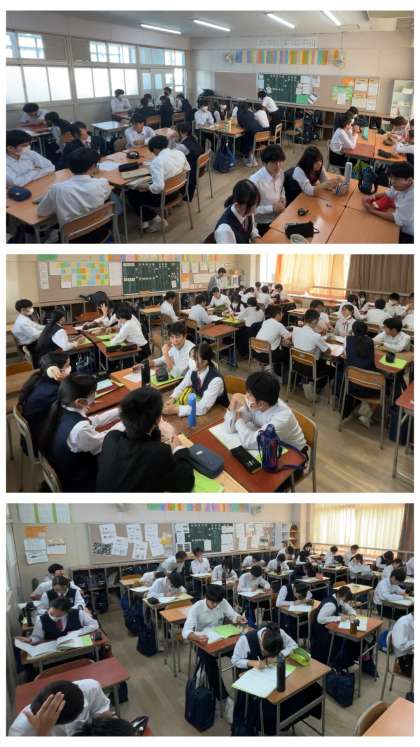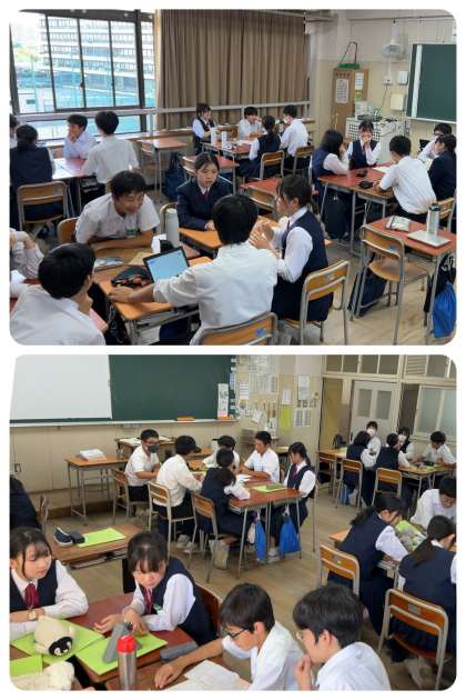 2年生は5時間目、学級活動の時間を使って、班会議を行い、振り返りなどを行いました。また、キャリアパスポートの記入では、小学校から受け継いできたファイルに、今回の行事の振り返りのシートを加えました。このキャリアパスポートは、進学先の学校でも使われていきます。最後に『心の天気』の入力を行いました。