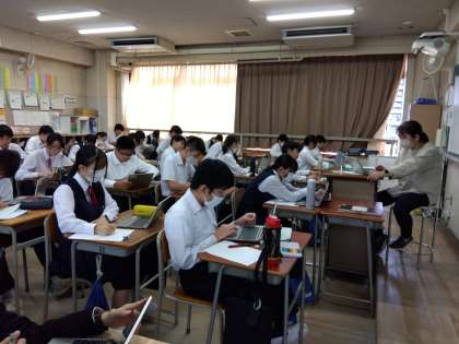 2年技術:SNSについて学習しました。生徒端末を使ってワークシートを作成しています。