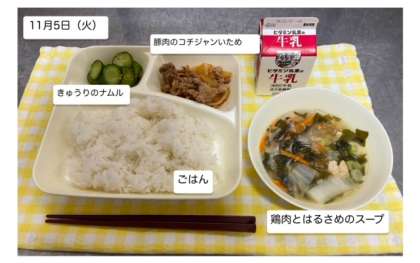 本日の給食では、「豚肉のコチジャンいため・鶏肉とはるさめのスープ・きゅうりのナムル・ごはん・牛乳」が提供されます。しっかりいただいて、健康の保持増進に努めましょう。