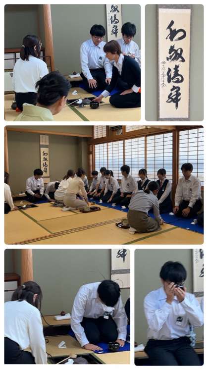 6クラス、各クラスを2つのグループに分かれ、12回のお茶会を切り盛りしていただいています。わずか20分ですが、お茶をいただいた後には、足がしびれて困っている生徒も見られます。一方で、初めから椅子の席も用意していただくなど細やかな心遣いしていただいています。ありがとうございます。
