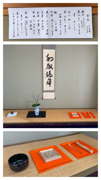 お香の焚かれた和室で、3年生はお茶とお菓子をいただいています。会記には、今日のお茶席の道具立て・お花・懐石・菓子などが記されています。