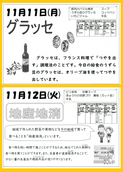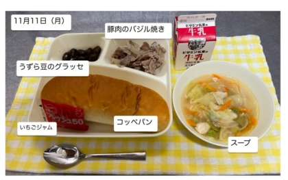本日の給食は、「豚肉のバジル焼き・スープ・うずら豆のグラッセ・コッペパン・いちごジャム・牛乳」が提供されます。グラッセは、フランス料理で『つやを出す』調理法のことです。うずら豆のグラッセは、オリーブ油を使ってつやを出しています。しっかりいただいて、気温の変化に対応できる健康の保持増進に努めましょう。