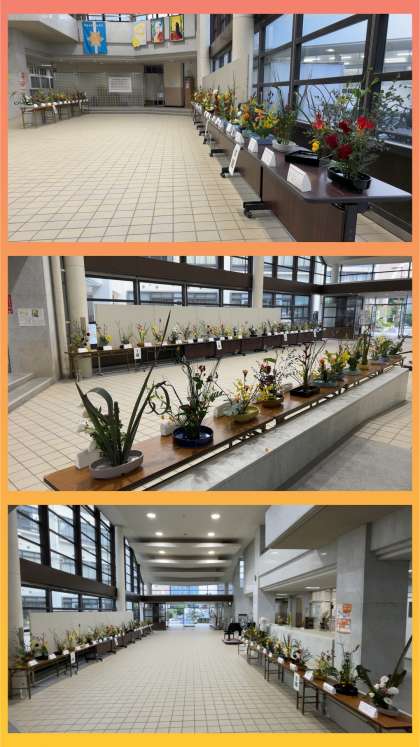 生徒たちが登校する直前のホールは、静寂に包まれ、華道体験の作品が生徒たちの登校を待ち侘びています。
