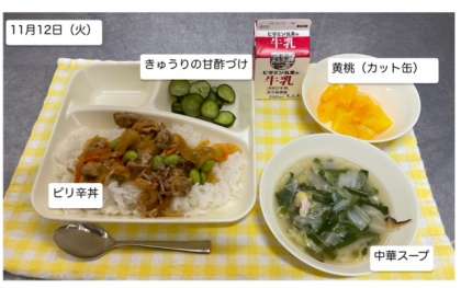 本日の給食は、「ピリ辛丼・中華スープ・きゅうりの甘酢づけ・黄桃(カット缶)・牛乳」が提供されます。しっかりいただいて、気温の変化に対応できる健康の保持増進に努めましょう。