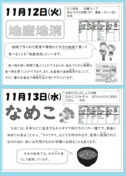 明日は、「なまりぶしのしょうが煮・なめこのみそ汁・ほうれんそうのごまあえ・ごはん・牛乳」が提供されます。『なまりぶし』は、生のカツオをさばいた後に、加熱処理を行い、燻製(焙煎)した加工品です。お楽しみに。