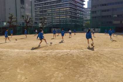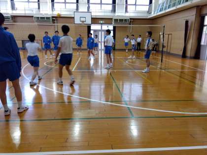 3年体育:女子は運動場でサッカーのパスの練習、男子は体育館でバレーボールのゲームをしました。