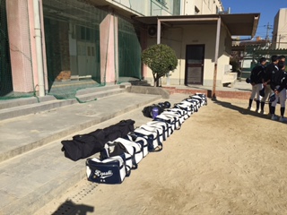 写真下 整然と並べられたカバンや道具(やっとこういう当たり前のことができるようになってきました。)