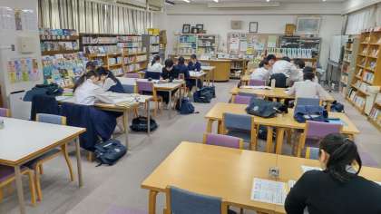 三年生は、午後からの進路懇談を控えて、図書室で時間待ちの間、自主的に勉強を行っています。