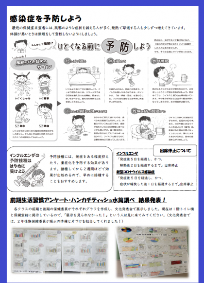 表面では、『歯と口の健康を自分で守ろう(11/8は いい歯の日)』と『いい姿勢の日(11/1)』の見出しの記事。裏面では、『感染症を予防しよう』の記事が掲載されています。また、文化発表会で掲出された、保健委員の活動の一環として作成した掲示物についての記事が掲載されています。ぜひご一読ください。