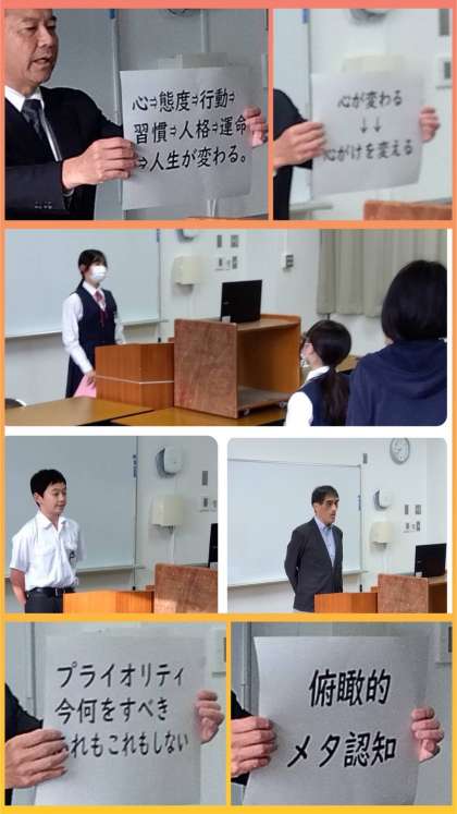 次に、校長先生からは、常置委員会からのアナウンスを受けて、「『目標』は、『ここを良くしたら学校生活がもっと良くなる』というポイントであり、『今の課題』と考えて、『自分ごと』として、心にとめて行動しましょう」という旨のお話。自分のことを『俯瞰的』に、そして『メタ認知的』に見つめて、『優先順位(プライオリティ)』をつけて行動しましょう」との旨のお話がありました。最後に『明日から急に気温が下がります。テストに向けて、家庭学習を充実させるとともに、健康管理を徹底して、万全の状態でテストに挑みましょう」とのエールで結ばれました。