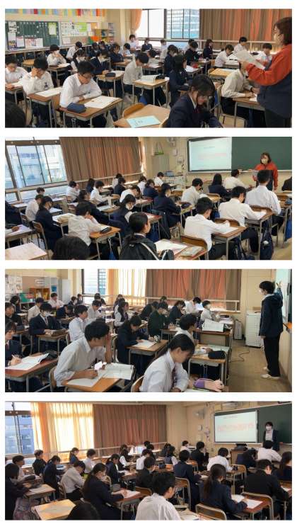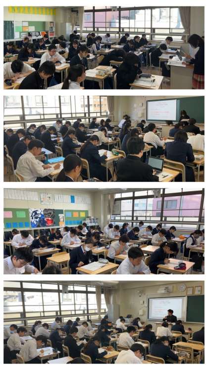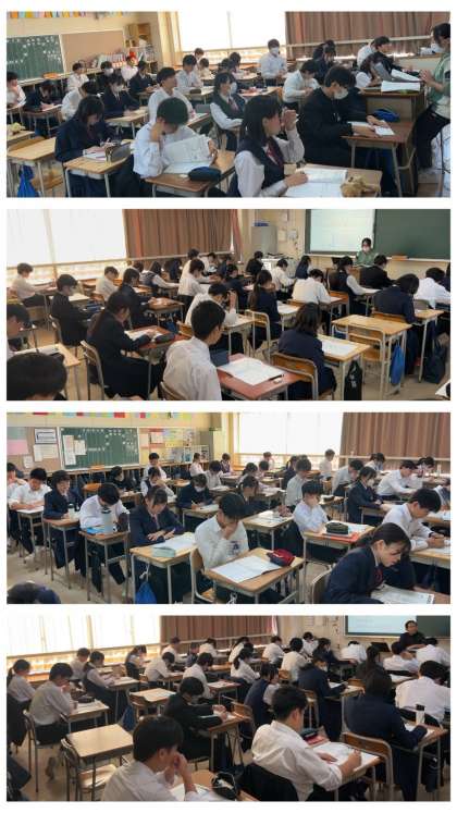 3年生が「そうどく」に取り組みました。来年開催される万博を題材にした資料を使いながら、創意工夫された授業が展開されています。まずは、初見の文書を読んで、『70字以上、90字以内』に要約する(まとめる)課題に取り組んでいます。黒板にはヒントがプロジェクターで投影されています。