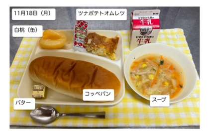 本日の給食は、「ツナポテトオムレツ・スープ・白桃(缶)・コッペパン・バター・牛乳」です。『ツナポテトオムレツ』は、「卵・ツナ・じゃがいも」を容器に入れて、焼き物機で蒸し焼きにしています。しっかりいただきましょう。