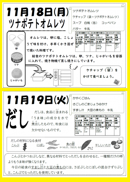 明日は、「かやくごはん・さごしのごまじょうゆかけ・すまし汁・大豆の煮もの・牛乳」が提供されます。お楽しみに。