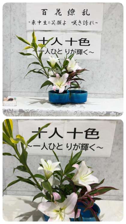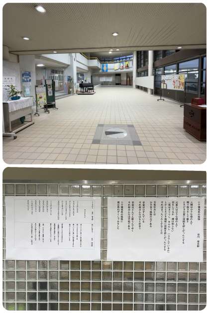 玄関ホールにあった華道体験の生花たちが片付けられて、もとのホールに戻りました。どこかお祭りのあとにようで、寂しい気持ちに見舞われます。そこに、百合の花輪の匂いと存在感のある生花が登場。お題は『雪の便り』、ユリとドラセナを生けていただきました。いつもありがとうございます。また、玄関ホールの突き当たりには、校長先生が全校朝礼で紹介された谷川俊太郎さんの詩も掲出されています。花を愛でて、詩を読み、心穏やかに学校生活を過ごしましょう。