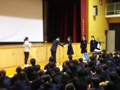 まず、表彰状の伝達です。ソフトテニス部女子団体、美術作品の表彰です。