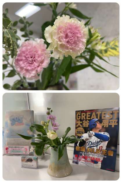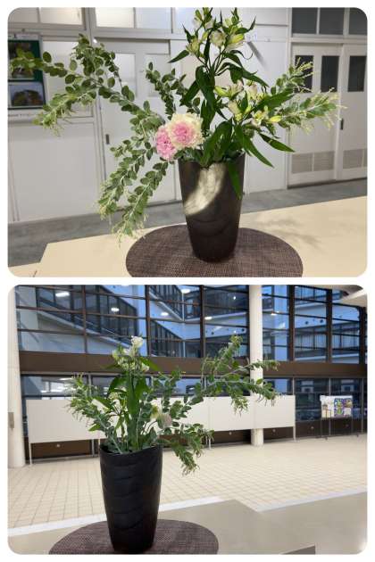 玄関とホールのお花を生け替えていただきました。玄関には『ユーカリ・アリストロメリア・トルコキキョウ』、職員室前には『ストック・ギボウシ』。いつも東中生のためにありがとうございます。