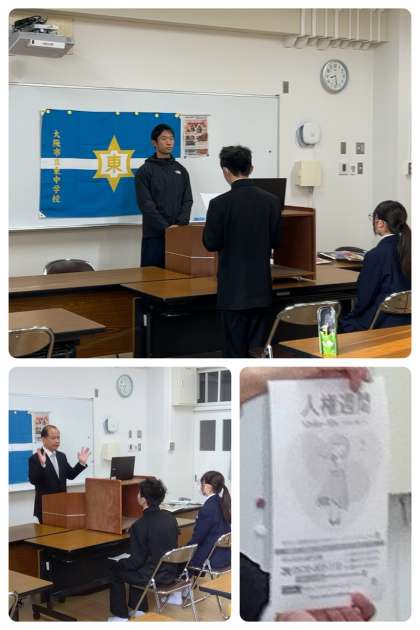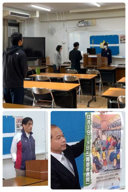 校長先生からは人権週間に関連してのお話でした。『地下鉄でスマホに集中するあまり、空いている座席の前に立ちはだかる人がいました。そこへ、その座席に座ろうとされている方が座れなくて、困っている場面に出会いました。横に居合わせた方が、声をかけるとその高校生は横にずれて、その方は座ることができましたが、少し視野を広く持てば、なんてことない場面です。しかし、あまりに回りを気にしていない事による小さな出来事でした。いつもピリピリとした生活をすることではなくて、少し回りを見る余裕を持ち、まわりで困りごとを抱えている人と出会った時に、自分ごととして、さっと行動できる人であってほしいものです』という旨のお話がありました。