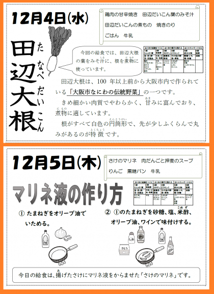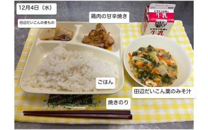 本日の給食では「鶏肉の甘辛焼き・田辺だいこん葉のみそ汁・田辺だいこんの煮もの・焼きのり・ごはん・牛乳」が提供されます。田辺だいこんは、100年以上前から大阪市内で作られている「大阪市なにわの伝統野菜」の一つです・きめ細かい肉質でやわらかく、甘味に富んでおり、煮物に適しています。しっかりいただて、健康の保持増進に努めましょう。