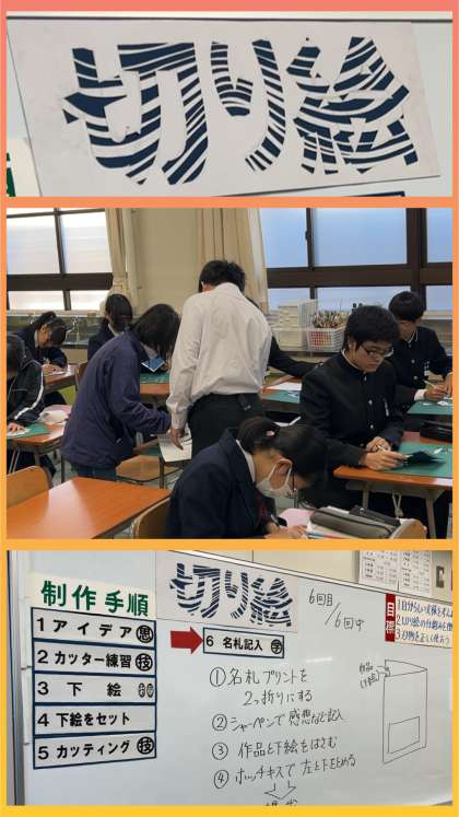 3年生の美術の授業では、『切り絵』に取り組んでいます。ホワイトボードには、素敵な作品とともに、制作手順が明示されています。
