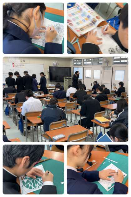 生徒たちは、自分で考えたデザインをケント紙に写して、カッターで集中して切り込んでいきます。完成が楽しみです。