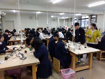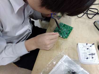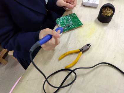 3年技術:ラジオの作成に取り組んでいます。半田ごてを使って、電子部品の取り付けを行いました。
