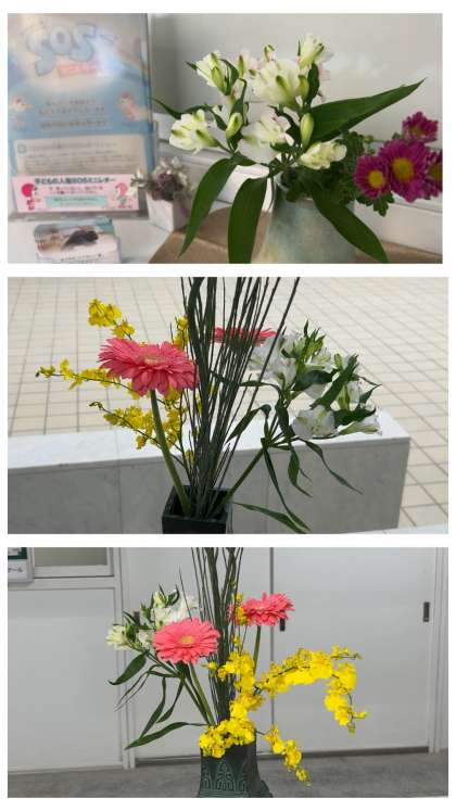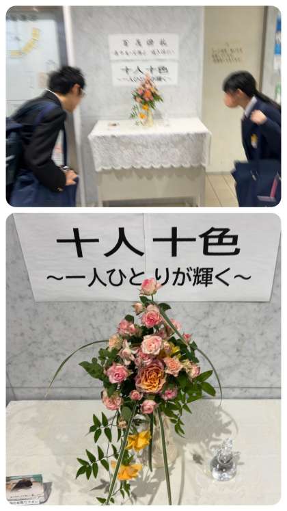 玄関付近のお花を3箇所とも生け替えていただきました。いつもありがとうございます。玄関のお花は『ひとやすみ』のお題で『バラ・ジャスミン』ガラスの雪だるまを添えていただきました。ホールには『ガーベラ・石化柳・シンピジウム・アルストメリア』、職員室前には『菊・アルストメリア』。1年間ありがとうございました。来年もどうぞよろしくお願いいたします。