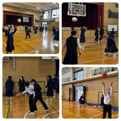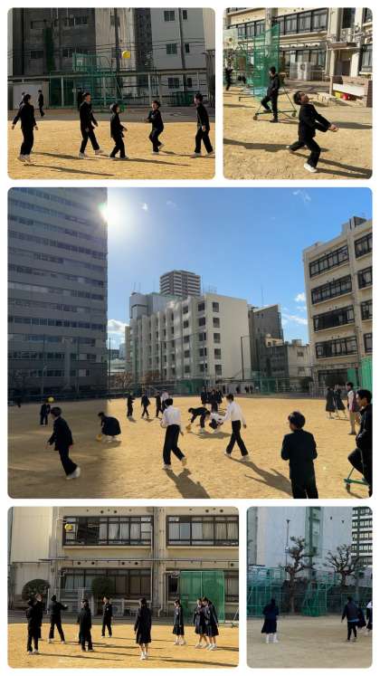 生徒たちの昼休み。体育館と運動場に学年で分かれて、短い時間ですが、気の合う仲間と楽しいひと時を過ごしています。先生の姿も見られます。