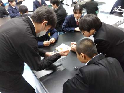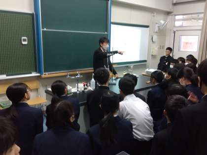 1年理科:再結晶の実験です。先生の説明を聞いてから、結晶ができる様子をルーペや双眼実体顕微鏡を使って観察しました。