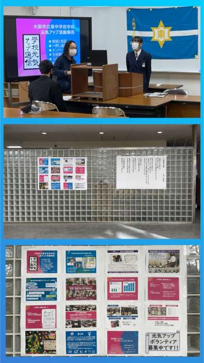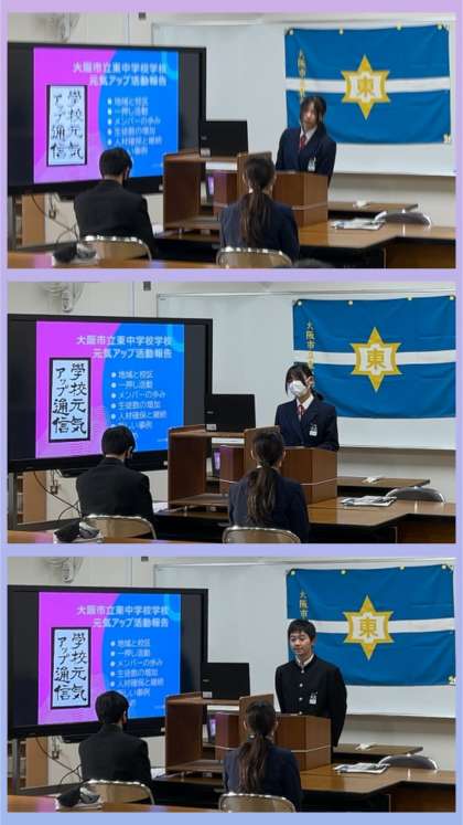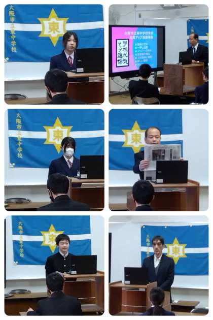 校長先生からは、『東中元気アップの取組が、大阪市の中学校の代表として、12月24日(火)には天王寺区の大阪教育大学キャンパスで、1月17日(金)には梅田の生涯学習センターで、2月8日(土)には天満橋のドーンセンターにて発表することになりました。』ということが披露されて、その時に使うプレゼンが示されました。そして、東中の教育活動が、生徒ファーストで、教職員と元気アップをはじめとする大応援団によって推進されていることが紹介されました。『生徒の皆さんは、関わっていただいている方々への感謝の気持ちを、挨拶に込めて交わしましょう。』と結ばれました。