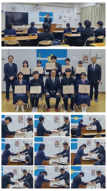 東税務署長さまはじめ関係の皆さまにお越しいただき、令和6年度中学生の「税についての作文」表彰式を行っていただき、ご講評とともに激励のお言葉をいただきました。ありがとうございました。