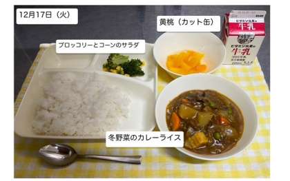本日の給食では「冬野菜のカレーライス・ブロッコリーとコーンのサラダ・黄桃(カット缶)・牛乳」が提供されます。今日の給食には「だいこん・れんこん・ブロッコリー」が使われています。手洗いをしてから給食をいただて、健康の保持増進に努めましょう。
