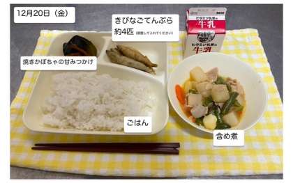 本日の給食は「冬至」(今年は12月21日)にまつわる献立「きびなごのてんぷら・含め煮・焼きかぼちゃの甘みつかけ・ごはん・牛乳」が提供されます。