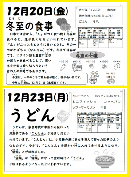 来週月曜日は年内最後の給食になります。「カレーうどん・はくさいのおひたし・ミニフィッシュ・コッペパン・ソフトマーガリン・牛乳」。お楽しみに。