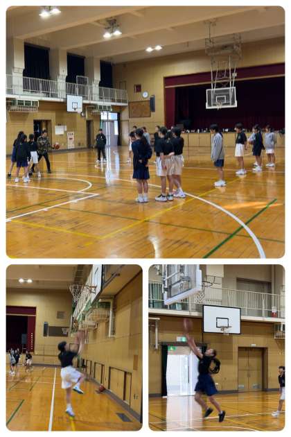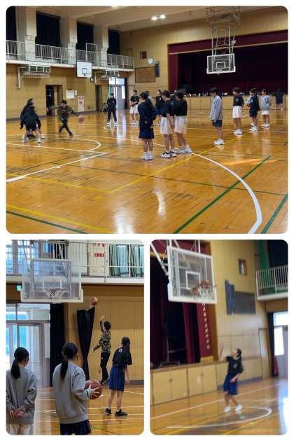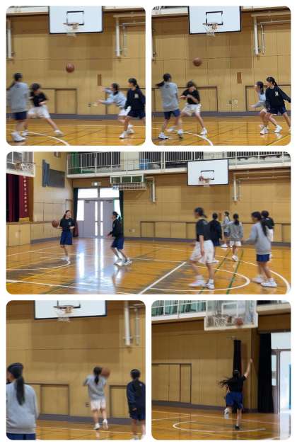 女子バスケットボール部が、体育館のオールコートを使って活動しています。チーム全体で、練習課題を明確にして、顧問の先生の実演を交えての説明をしっかりと聞き、仲間とコミニュケーションをとりながら、練習が進みます。